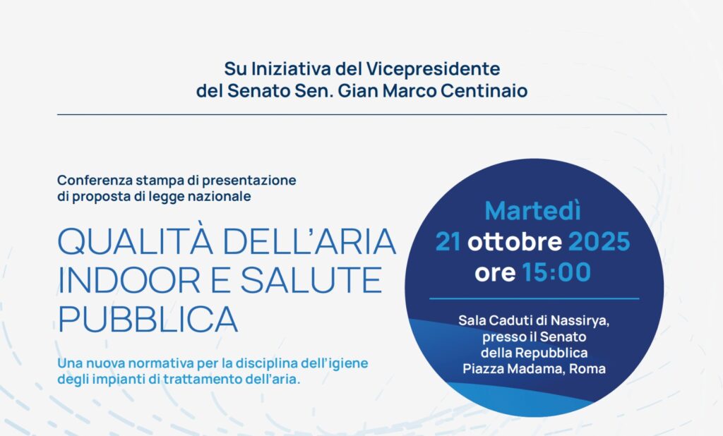 Su iniziativa del Vicepresidente del Senato, Gian Marco Centinaio, sarà presentata in conferenza stampa una proposta di legge nazionale destinata a introdurre un nuovo quadro normativo per la gestione e il controllo degli impianti di trattamento dell’aria. Un nuovo approccio alla qualità dell’aria indoor La proposta legislativa rappresenta un cambio di paradigma: dall’attuale sistema frammentario […]