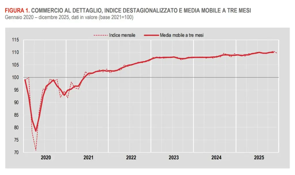 ROMA (ITALPRESS) – A dicembre, secondo i dati Istat, le vendite al dettaglio registrano, rispetto al mese precedente, un calo sia in valore sia in volume (rispettivamente -0,8% e -0,9%). La diminuzione riguarda tanto i beni alimentari (-0,9% in valore e -1,2% in volume) quanto quelli non alimentari (-0,7% in valore e -0,8% in volume). Nell’ultimo trimestre del 2025, in termini congiunturali, le vendite al dettaglio registrano un incremento in valore (+0,3%) e in volume (+0,1%). Le vendite dei beni alimentari aumentano sia in valore (+0,3%) sia in volume (+0,2%), così come quelle dei beni non alimentari (+0,2% in valore e in volume). Su base tendenziale, a dicembre 2025, le vendite al dettaglio registrano una crescita dello 0,9% in valore e un calo dello 0,2% in volume. Le vendite dei beni alimentari aumentano in valore (+1,7%) e calano in volume (-0,6%) mentre quelle dei beni non alimentari aumentano sia in valore (+0,3%) sia in volume (+0,1%).